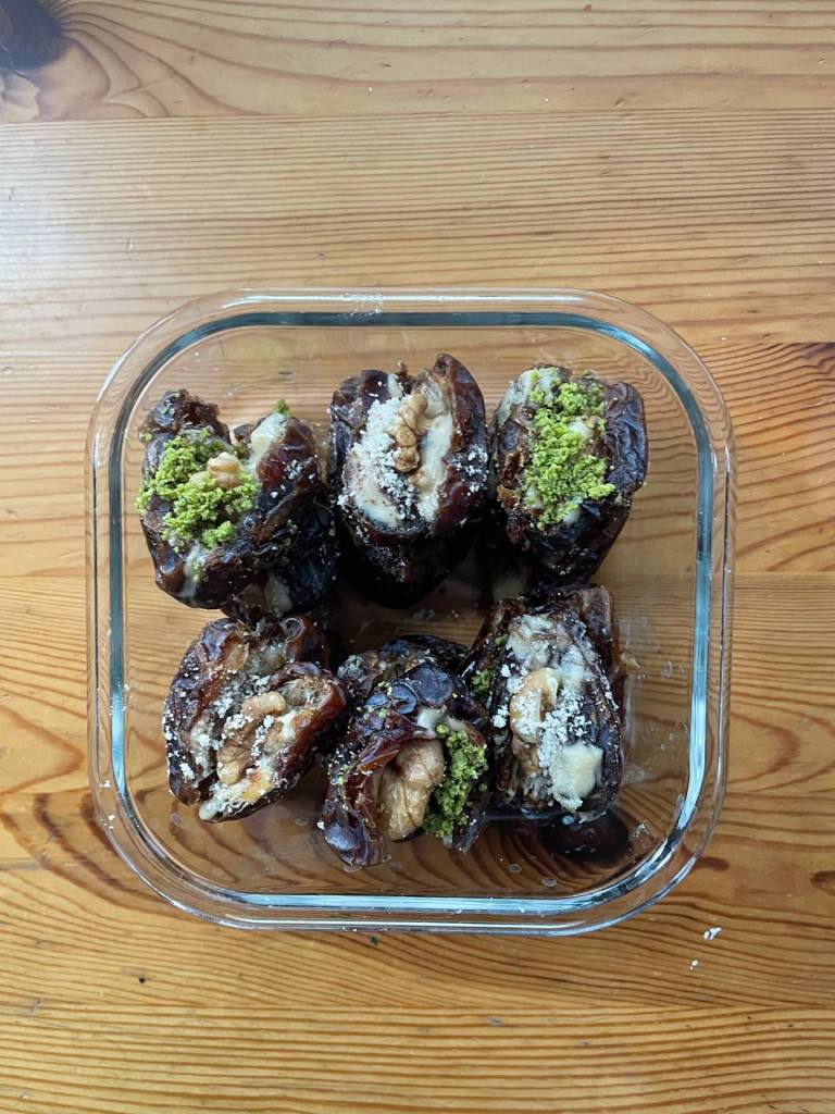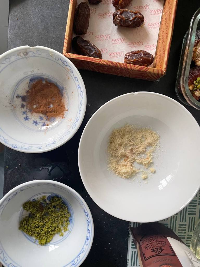 Since I was just doing a trial run, I opened the date up and poured the flour into it. This gave me an idea! Maybe the solution to not having rotab is to present ranginak in a different way? The layering works well with rotab because they are so soft, that your spoon just goes through them like you are having a cake. Stipulating that we can’t soften the dates, perhaps presenting them as stuffed works… fine? It won’t have the texture of ranginak, but it doesn’t have the issue of making the eating experience difficult.