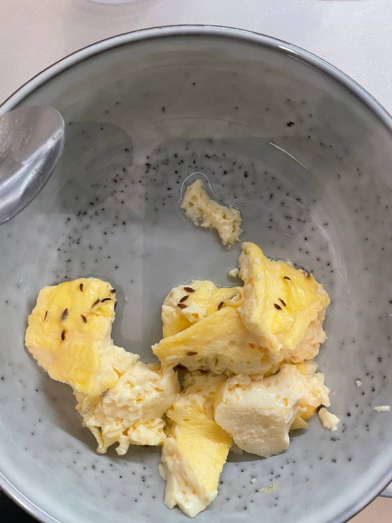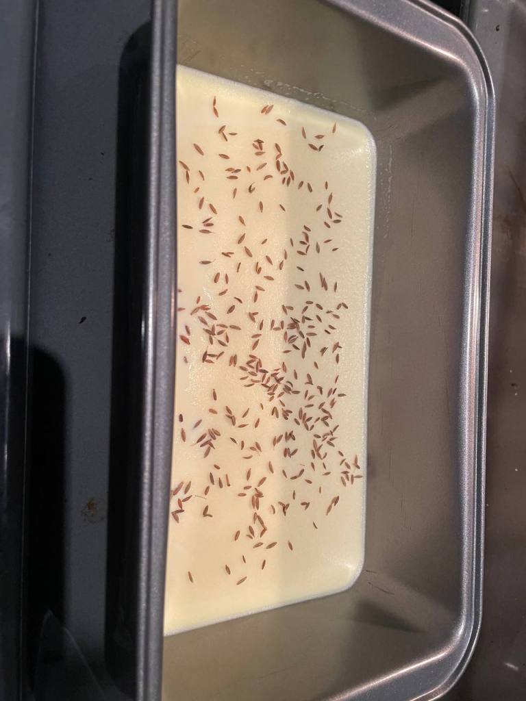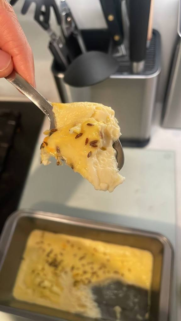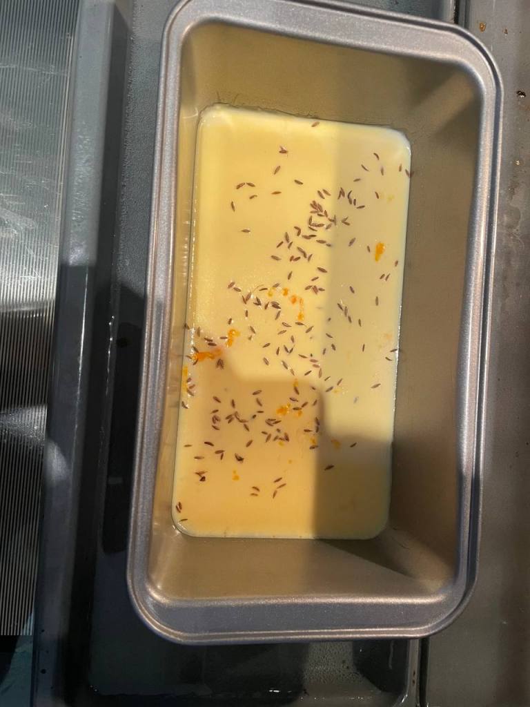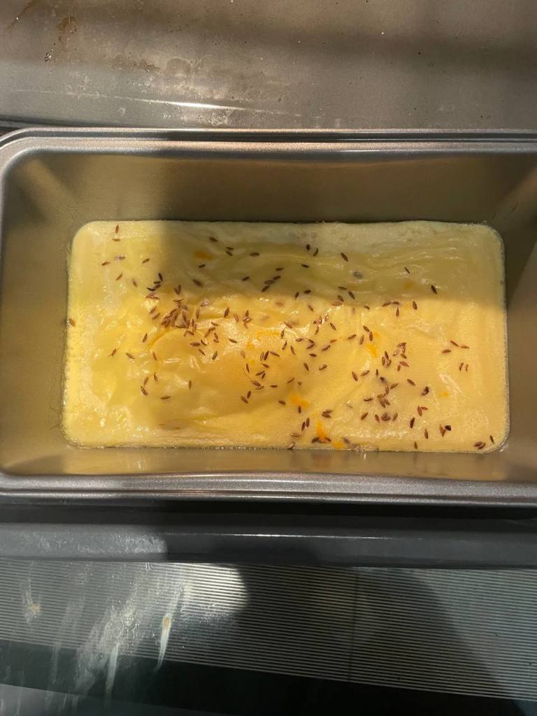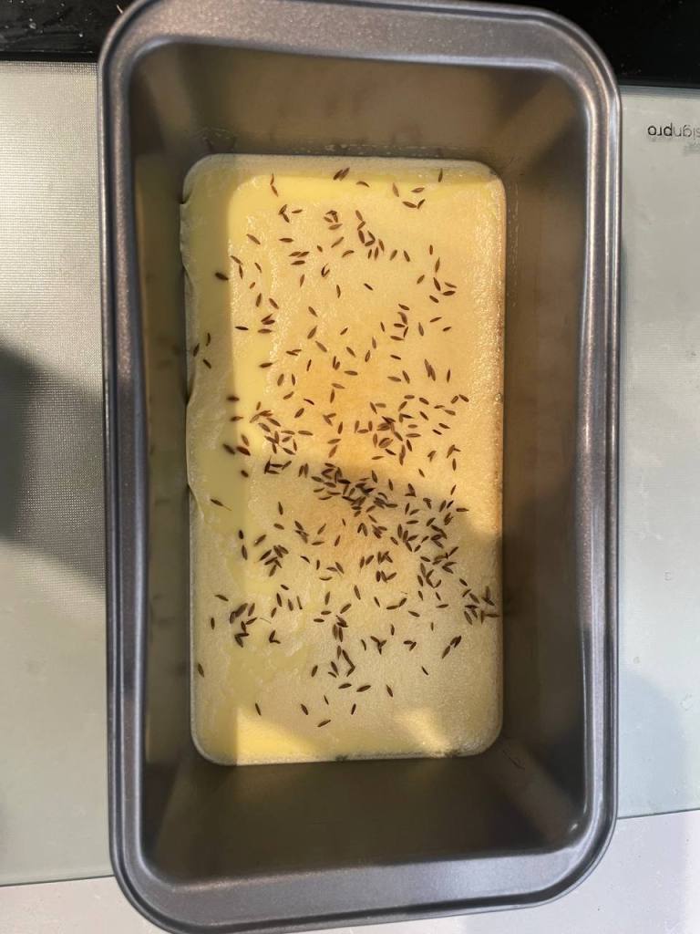 Put the mixture in your desired baking dish, and then cook with bain-marie at 180 degrees. At around 5-10 minutes4 the top will start to set. At this point sprinkle cumin seeds. Then bake for another 30 minutes.