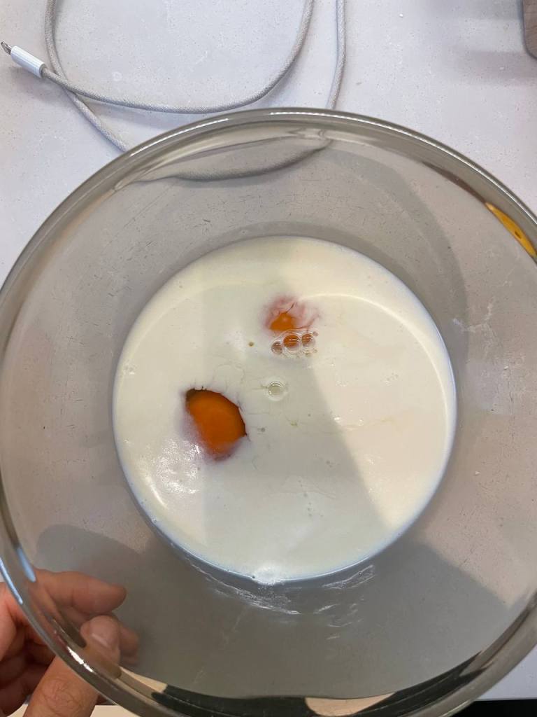 Here you can see that I didn’t use a blender, which is why you see some of the yolk. The biggest difference when using fresh milk is that the top starts to form a layer (as milk does when you heat it). At this point I decided to take it out of the oven as I was worried of it burning, which meant that it didn’t set too well. As soon as I took a bite though, I understood that it wasn’t just the cooking time that affected how it set: it was also the extra egg, whose flavor could not be ignored!