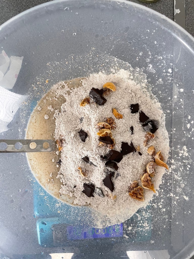 1. Dissolve the levain into the water, then add your dry ingredients. Mix until combined and leave for around 10 minutes to firm up