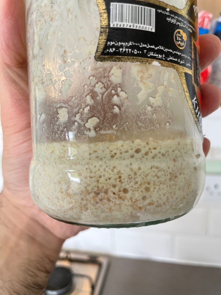- 120 g 100% hydration wholemeal wheat levain (last feed 8-12 hours ago)