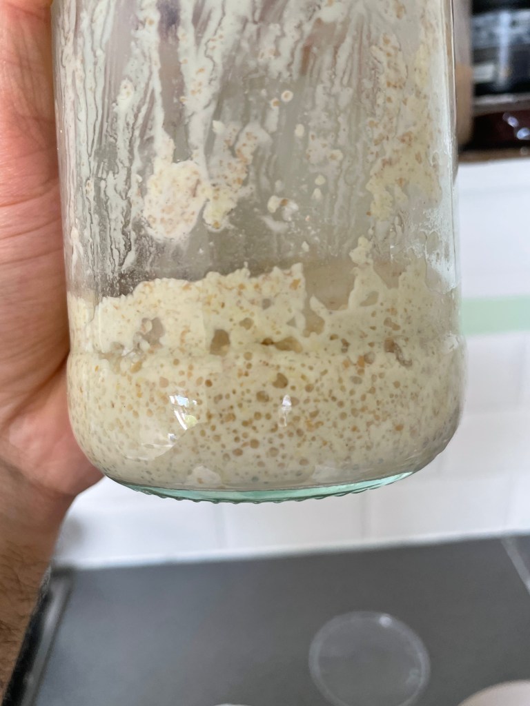 Before adding semolina to my bread, I was curious to see if Dusty can have semolina. She seemed to enjoy it quite a bit, though because semolina is fairly dense, the levain never rose that much. I didn’t run any thorough experiments to measure the effect of using semolina on the bacteria/yeast cultures, but anecdotally I can confirm that the breads that I made with the semolina levain had excellent rise.