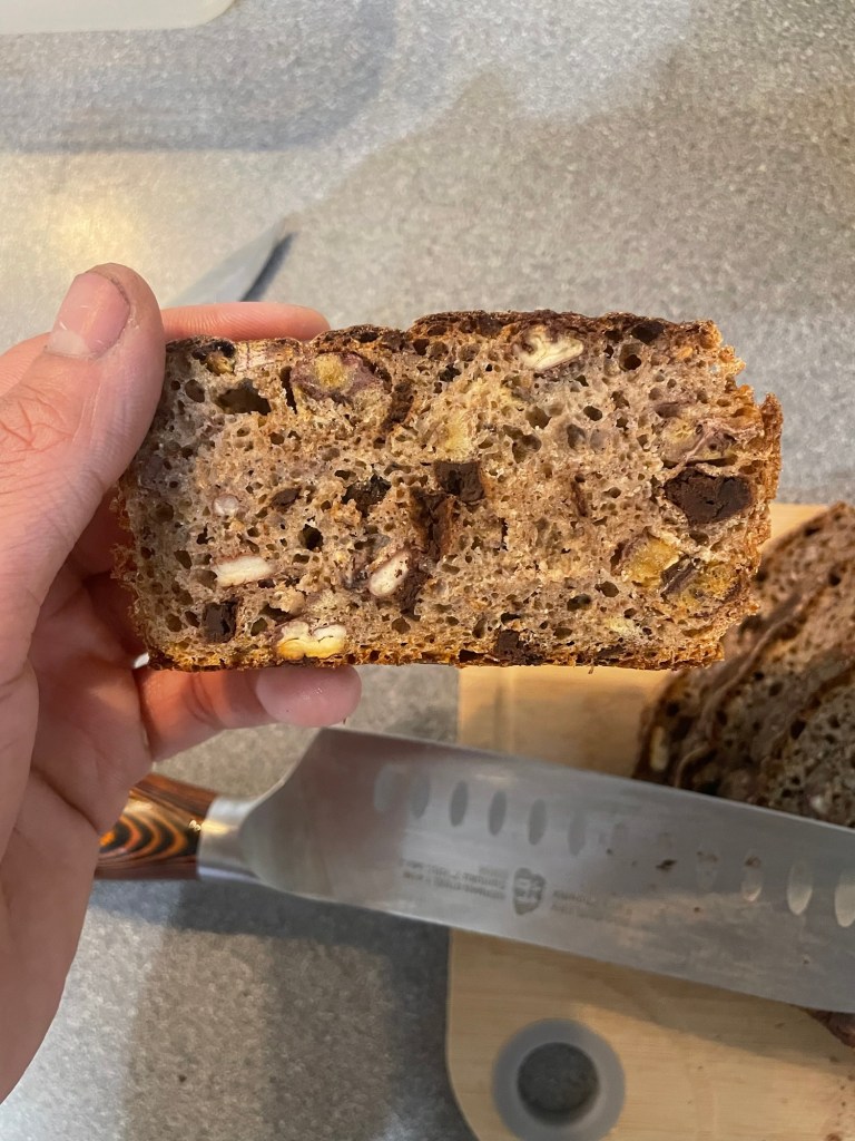 I had also baked some bread for us: a rye-wheat loaf filled with pecans, dried bananas and dark chocolate.