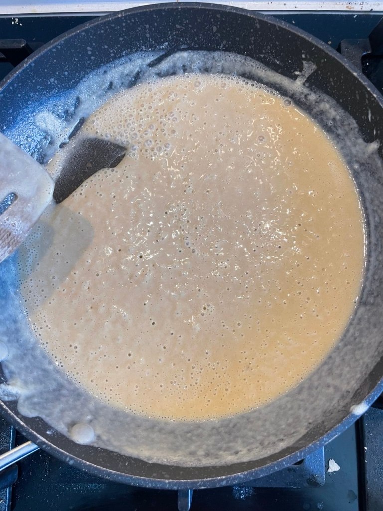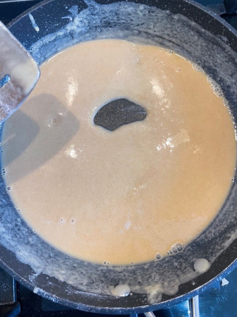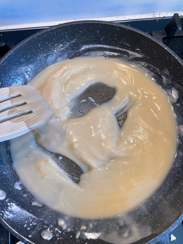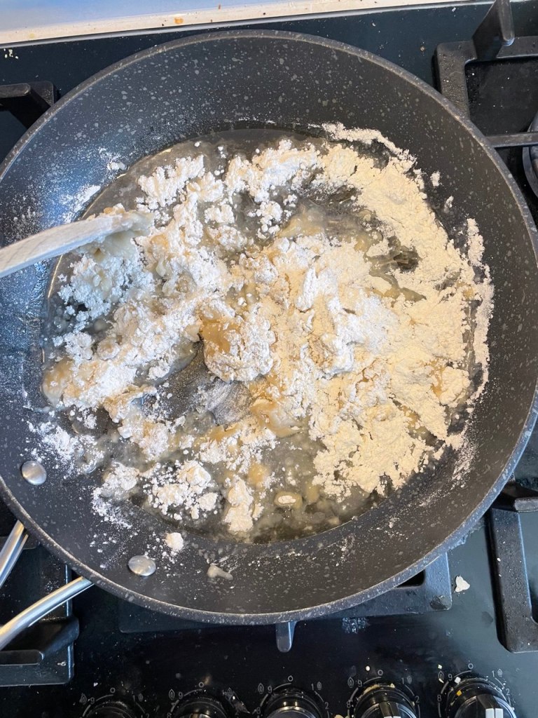- Keeping stirring until the flour turns a beautiful red color