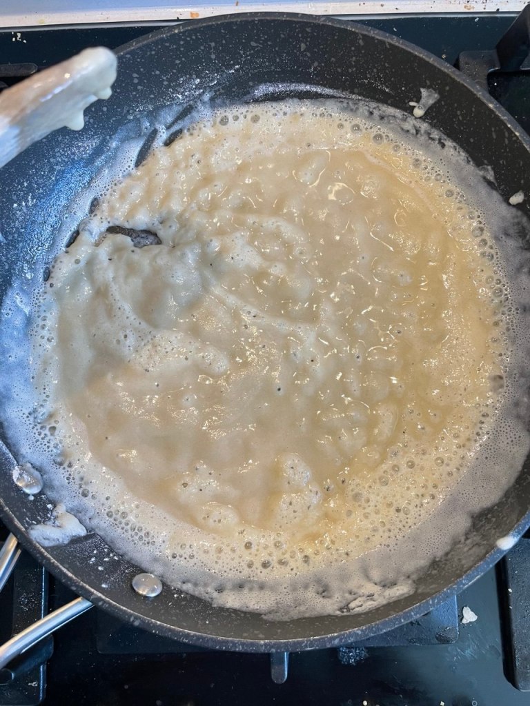 Looking back, part of the reason why this went wrong is because I doubted my aunt: she mentioned explicitly the need for turning the flour “red” (which I take means brown). I assumed she meant golden, so stopped a bit too early. Further, note that I used white flour when she suggested using type 2 flour, which is a bit darker. I doubted this because the astomazatas I’ve tasted don’t have that earthy flavor characteristic of wholemeal flour. I still believe this, so next time I make this I’ll try white flour again but I’ll make sure to toast it to brown without burning it.