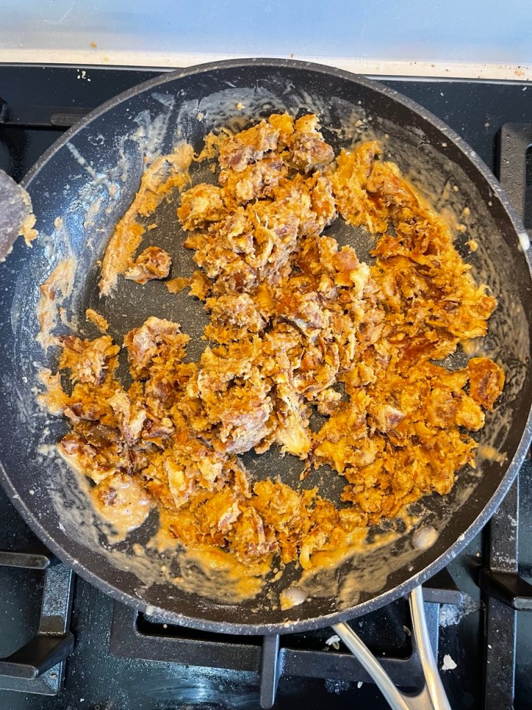 - Using a flat ended spatula, break up the pieces of the dates until you have a consistency that resembles minced meat. At this point you should also turn off the heat