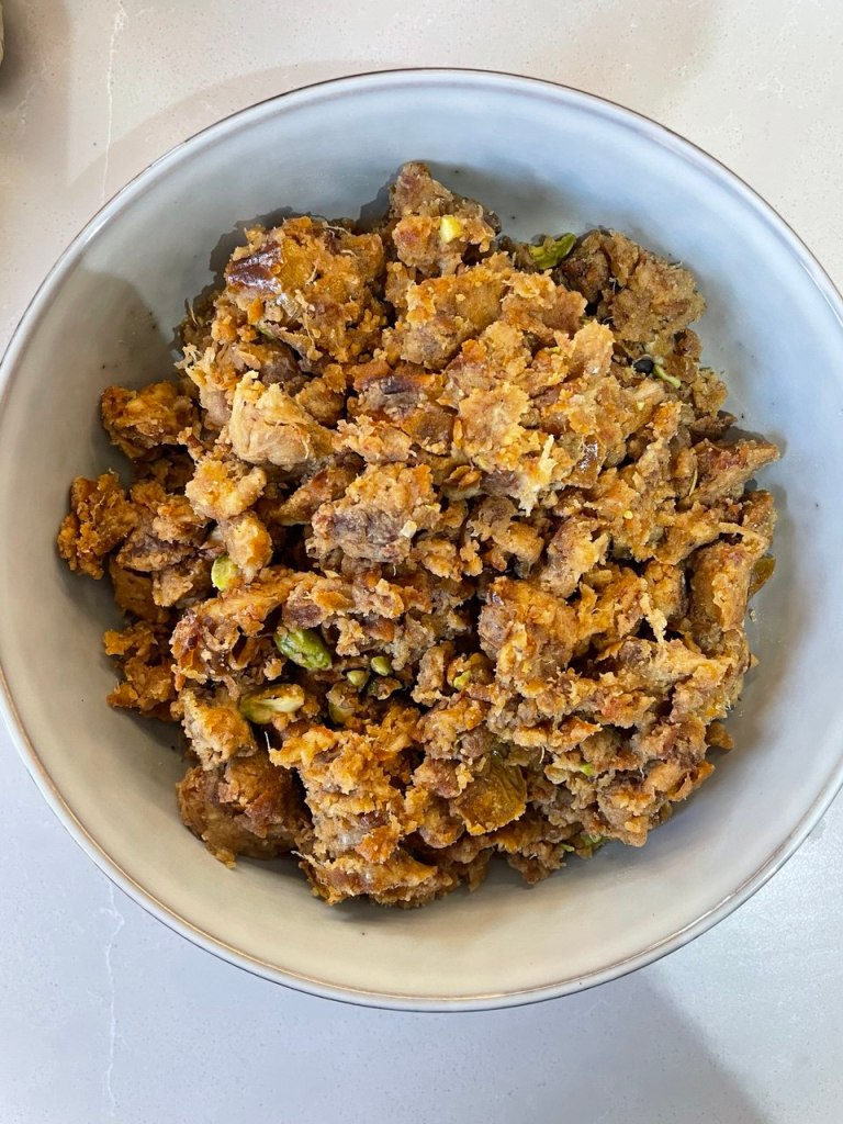 I’m not sure what category of dessert Astomazata falls in, but the texture really reminds me of a sweet minced meat. So perhaps you can think of it as the British “mincemeat”, but instead of using it as a filling for pies, us Evazis either enjoy eating chunks by hand, or having morsels of it with flatbreads, like Gapok.