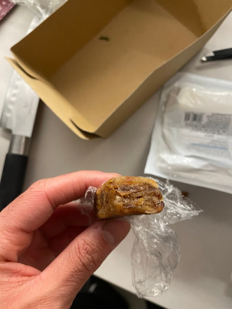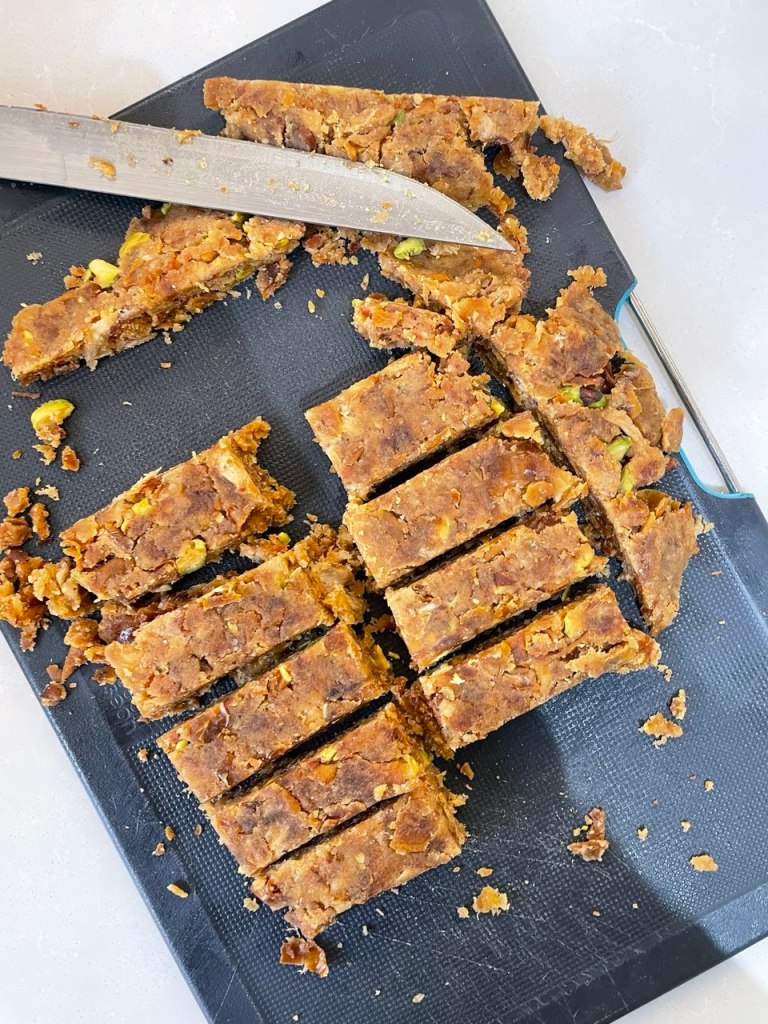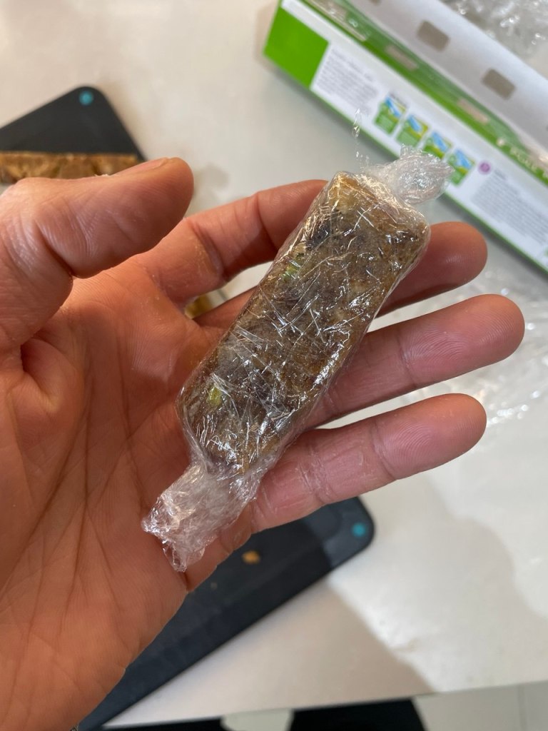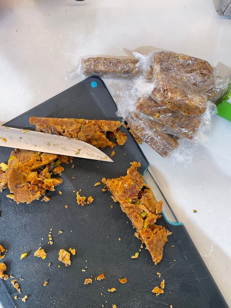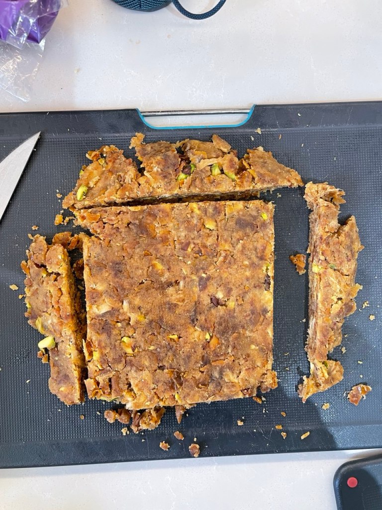 I clumped the astomazata together using two chopping boards and let it set in the fridge. Then broke it into bars using a sharp knife before wrapping with cling film. This to me was kind of a success, as I find it much more nutritious and less processed than store bought energy bars!