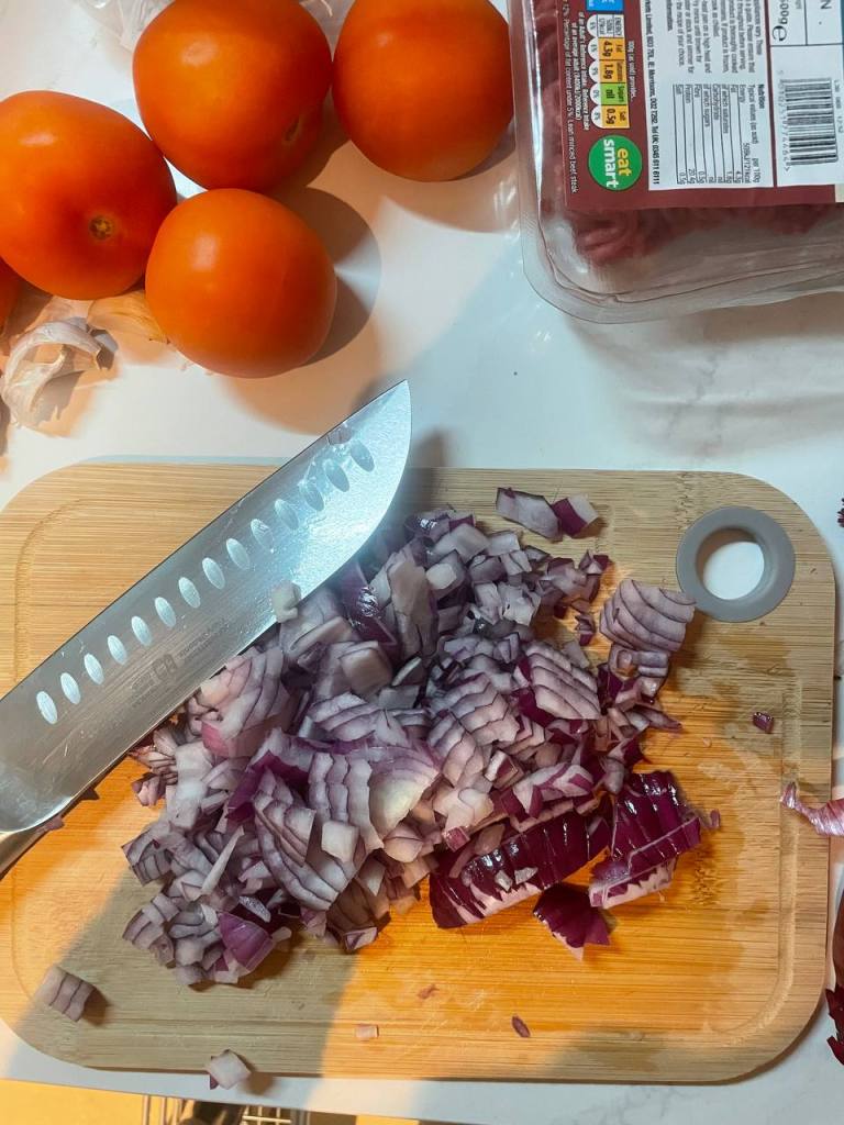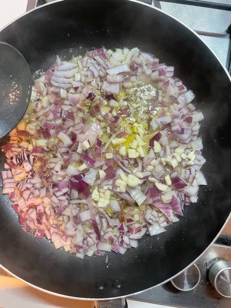 - Dice the onion and garlic cloves finely, and then fry in olive oil4 until golden