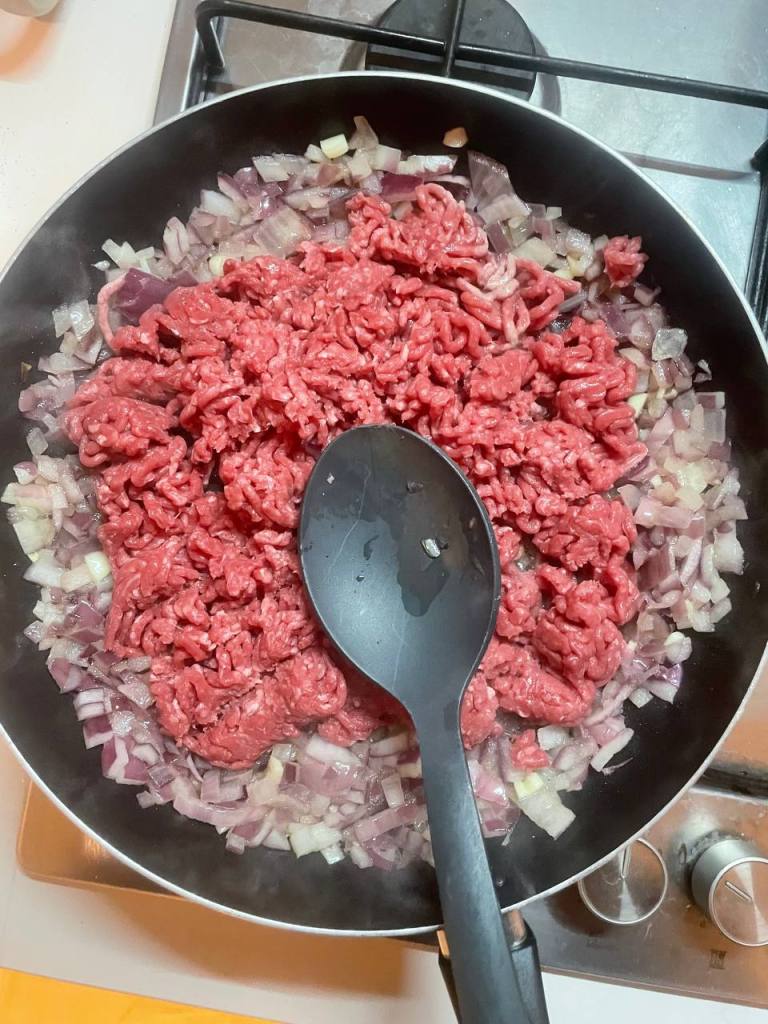 - Add the minced meat and break it up with the end of the spatula. Cook until browned