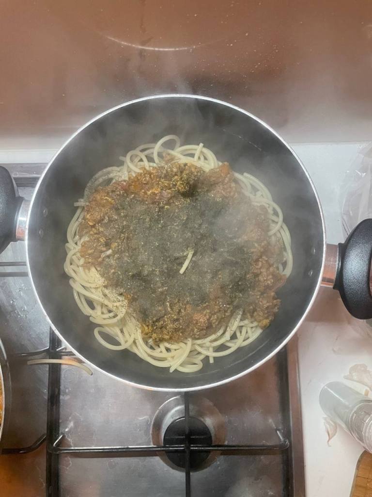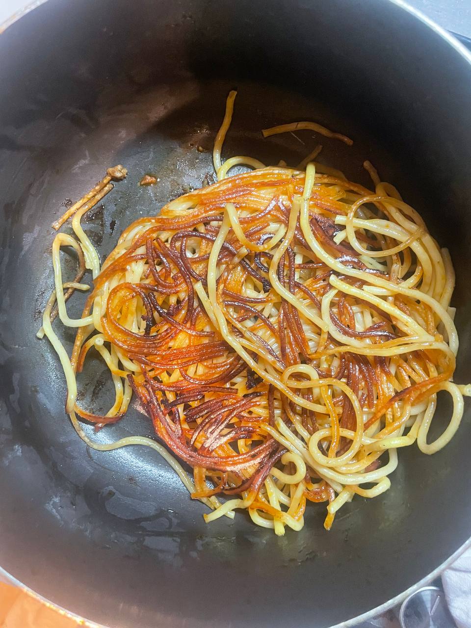 - In the meantime, cook the spaghetti in well-salted water until al-dente, and at this point do what would make every Italian scream in pain: drain the pasta water and run the pasta under cold water. We do this to prevent the pasta from cooking any further, as we’ll soon steam it dum pukht style. If it cooks too much now, the pasta will end up becoming soggy.